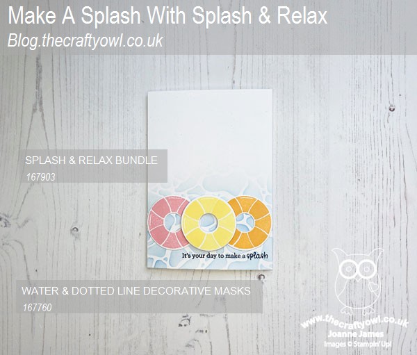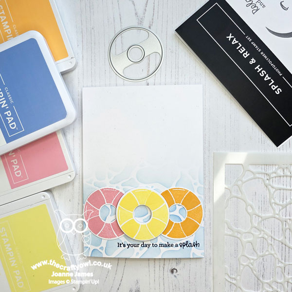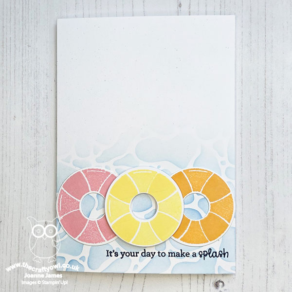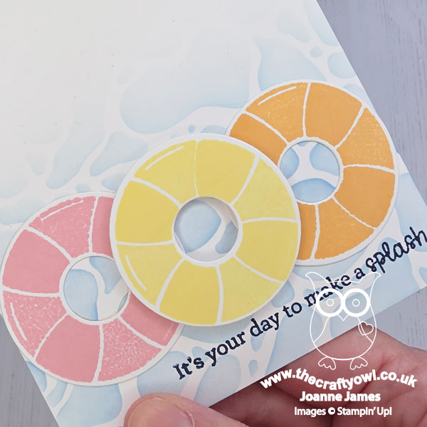 Make A Splash - I chose inflatable rubber rings (as opposed to donuts) for the three circles of the sketch, courtesy of the new Online Exclusive set 'Splash & Relax' which will be available in May. There are some great sentiments in addition to a selection of rubber rings and beach balls in the stamp set, but the dies that coordinate are so much fun - they include a sun visor, smoothie cup and sunglasses amongst other things! I almost chose three separate die cut images, but decided to keep things simple with a trio of rubber rings. I chose the colours of the sprinkles for each one - this does make them look rather like Party Rings though! Do any of my overseas readers know what I'm talking about? Party Rings are a ring shaped biscuit (aka cookie) with pastel icing on the top that are beloved of UK children everywhere - or certainly the James Juniors and their friends when the were little.