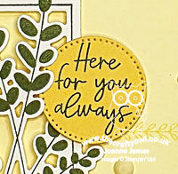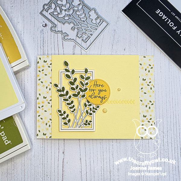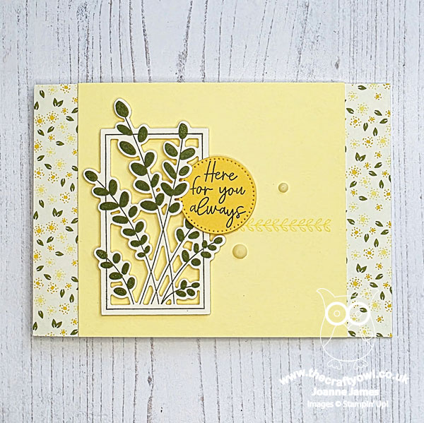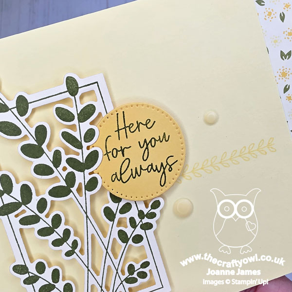 My eye was immediately drawn to the vertical rectangle in Jen's sketch and I thought it would be perfect for the main image in the Friendly Foliage bundle. Once that decision had been made, everything else flowed from there! I chose some light and summery retired Floral Delightpapers for the background (perfect for the uplifting sentiment) and picked out the colours for both my stamping and layers that make up the rest of my card. I did tweak the sketch slightly (I hope Jen doesn't mind) as I wanted the circle to be my sentiment, so in order to keep things balanced I stamped a decorative line where the sketch sentiment banner would have been - you can see it more closely below: