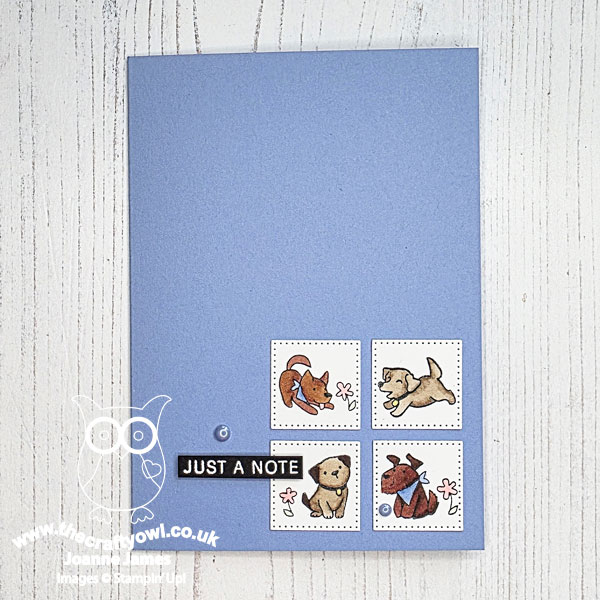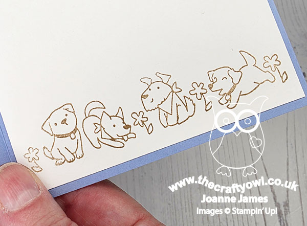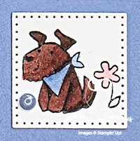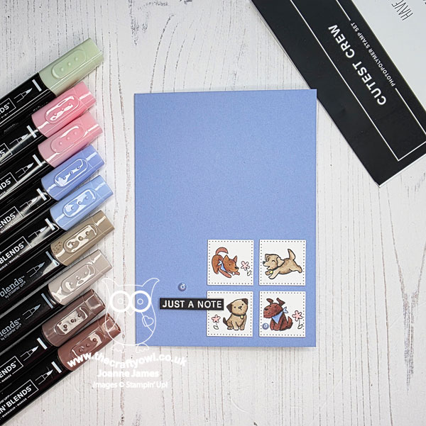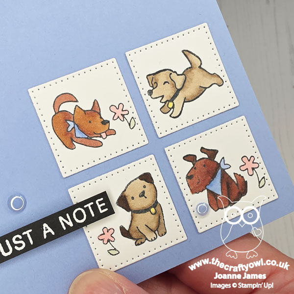 Cutest Crew - I'm sure my regular readers would have guessed that the 'Cutest Crew' stamp set might make an appearance today - after all, those kitties and puppies are just too cute! I actually bought this set originally because of the dogs, but until now I've only used the birds and the cats - go figure. Today's card was the perfect opportunity to remedy that though, so puppies for the win! Instead of stamping the row intact, I stamped each puppy individually, masking off the others each time, so that I could then diecut 4 squares as per the sketch. I coloured them with my Stampin' Blends - you can see the detail more closely below: