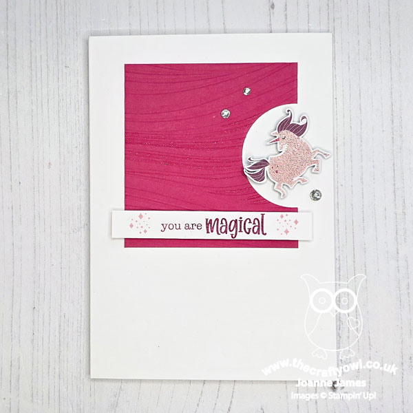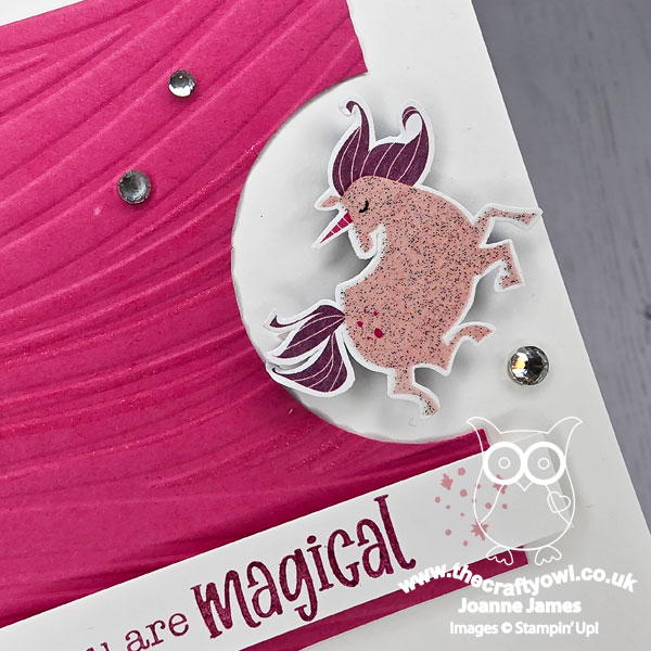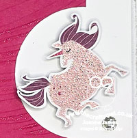 I embossed my panel of Melon Mambo cardstock with the Soft Waves embossing folder for a sense of movement and added some clear Wink of Stella for a subtle unicorn trail. Check out that sparkly unicorn: