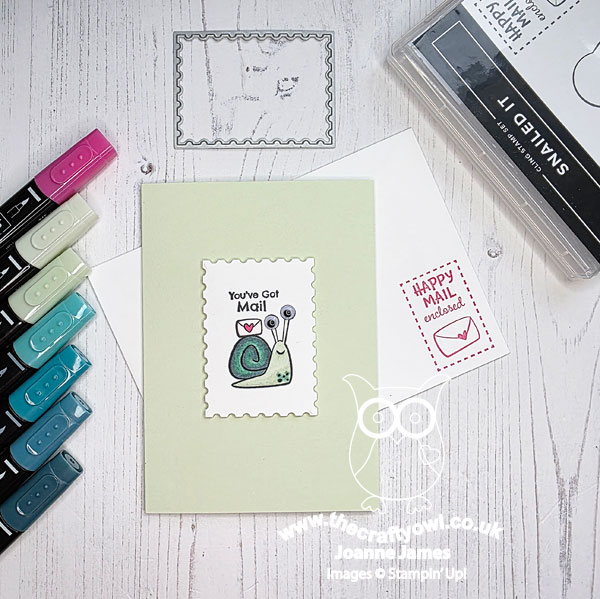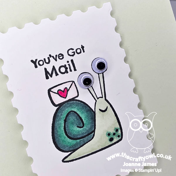 That letter-carrying snail is so cute and the colours at Colour Dare were perfect for his slimy body and shiny shell (I used both greens with a pop of pink for the heart and my envelope decoration). I cut him out with one of the Perennial Postage Dies to add to the theme and I also added a pair of googly eyes because, well - everything is more fun with googly eyes, right?