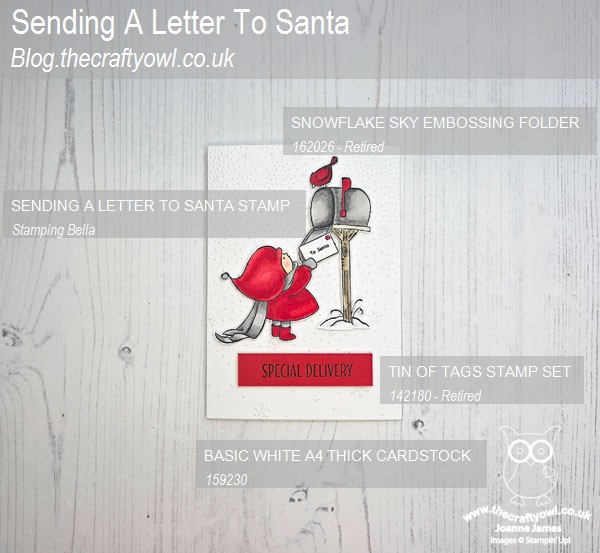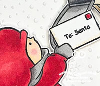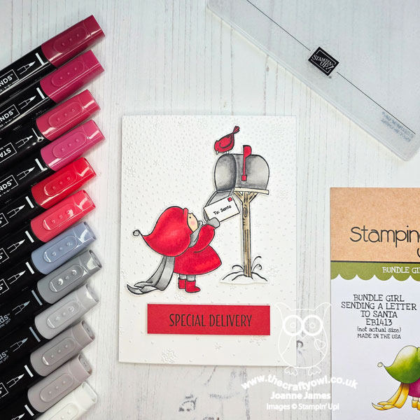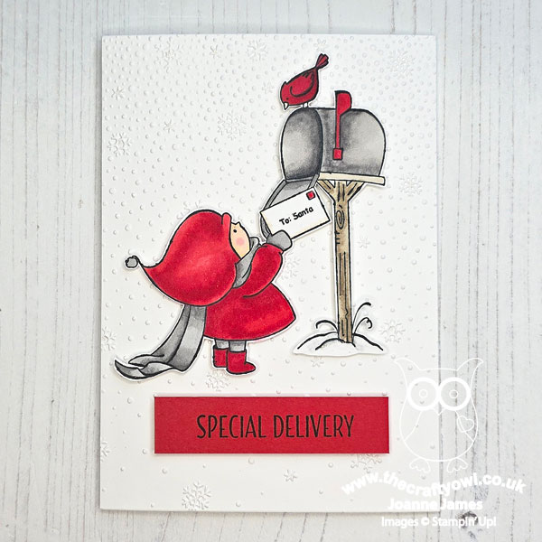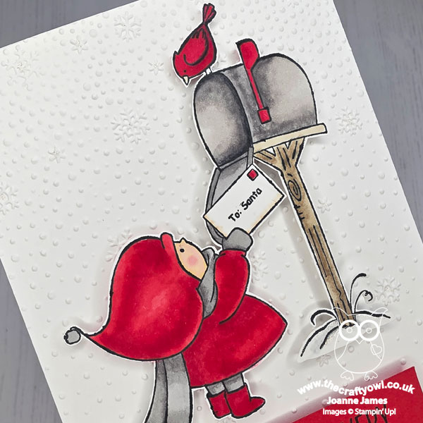 The red and grey colours were perfect for my postbox, with a cardinal looking on as my little bundle girl reached up to post her letter. Once coloured, I fussy cut my image then popped it up onto an embossed snowy background:
