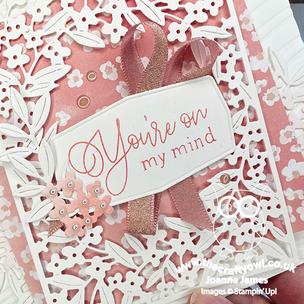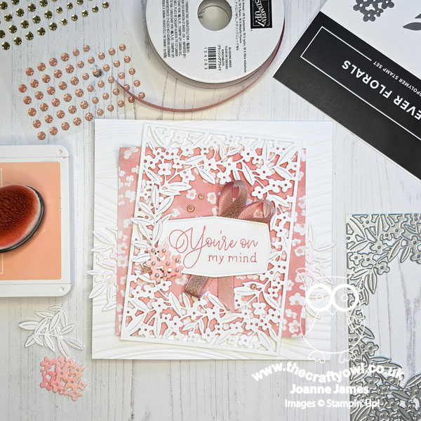 Farewell Pretty In Pink - Pretty in Pink is definitely my favourite of the retiring in-colours and today's card is a real celebration of it. I used it for the base, in my stencilled blooms and my sparkly gems (recipe item number five):