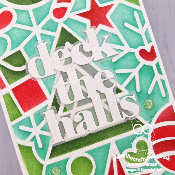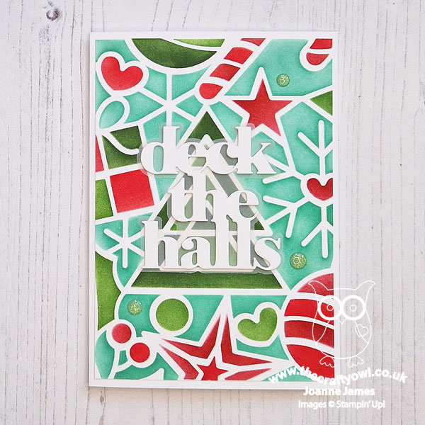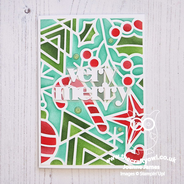 The stencil is called Christmas Bauhaus by Uniko (they also do a similar non-festive design which is already in my shopping basket) and consists of three layers that piece together to create this fun design. I stayed with traditional red and green for my colour scheme today, and cut a base in mat in the same colours before adding my stencilled panel and a heat-embossed retired sentiment from the 'Greetings from Santa' stamp set. The only other thing I needed to do was add a bright red shiny enamel dot to Santa's nose: