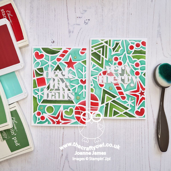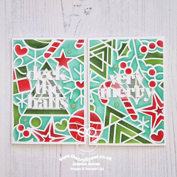 Finally, here's a shot of both cards next to each other so that you can see how the stencil design looks 'as one' (including the whole bauble!):