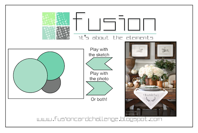 I'll confess I found this a big challenge! There aren't many colours I actively avoid using, although there are definitely some I use far less than others! Orange only features during pumpkin season (or for snowman carrot noses!) but a review of my back catalogue showed me there was another colour that I rarely use - and it might surprise you! I don't often use colour as a starting point on a project either - so making one languishing at the bottom of the pile and making it the focus of my card was a real challenge! I still had a helping hand, in the form of the current Fusion sketch and this week's hot drink theme over at Global Design Project to create my card - take a look:
