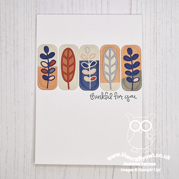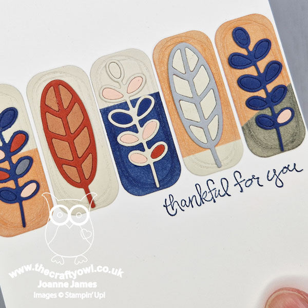 Those pretty little foliage dies are part of a larger set called Friendly Foliage that consists of both a stamp set and dies. I had intended to use the main stamp and die in this set, which is perfect for a clean and simple card, however when I saw the inspiration photo over at Inspired By this week, I thought I'd have a go at creating some little panels inspired by those in the photo - can you tell which ones I chose? I followed the sketch too, using 5 diecut swirly rectangles in Basic Beige as my base (cut with the retired Beautiful Shapes Dies), masking each one and adding ink with a blending brush where required. I then added my diecut foliage, having paper-pieced in the sections in a variety of different colours: