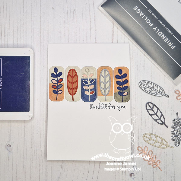 I'm not going to lie, for a clean and simple card this did take quite a while to create due to all of the diecutting and piecing involved, but I'm very pleased with the result! A thankful sentiment (from the retired 'Good Greetings' stamp set) in Night of Navy completes my card - and also means I am linking up with the team over at Addicted To CAS where their new codeword is 'thankful'. The Friendly Foliage stamp set and dies make for beautiful and simple designs and you can be sure you will be seeing more if them in the coming weeks.