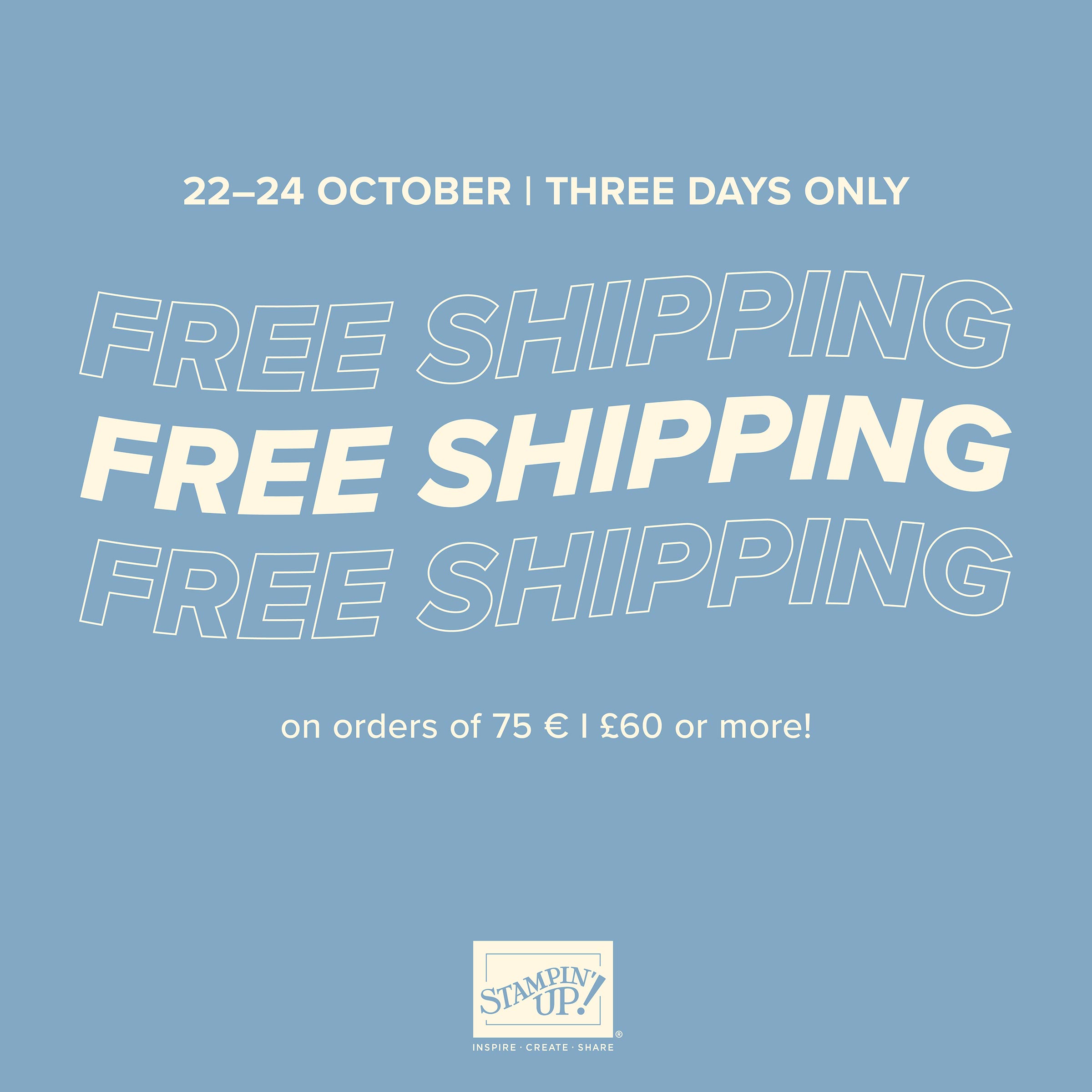 - Free shipping is for three days only. Orders must be opened and closed during 22-24 October.