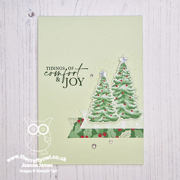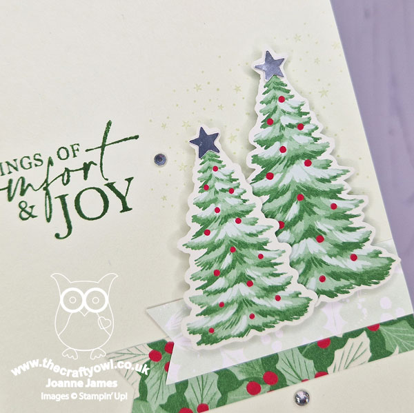 This one features a couple of trees, one a diecut and the other fussy cut from the DSP, to which I added a couple of silver foil punched stars, along with some clear rhinestones and a retired sentiment.