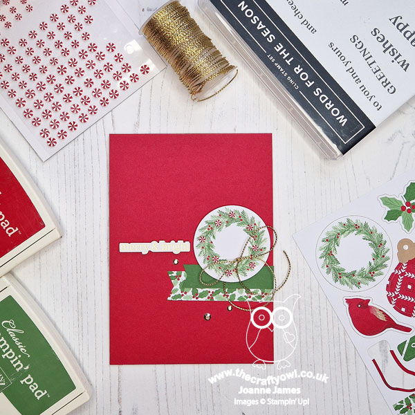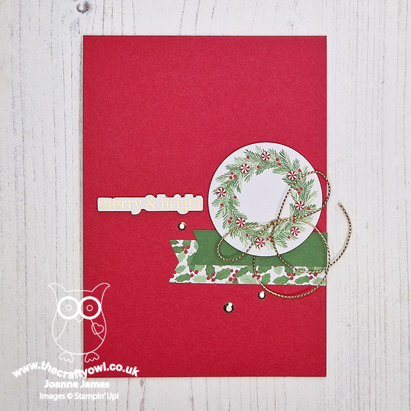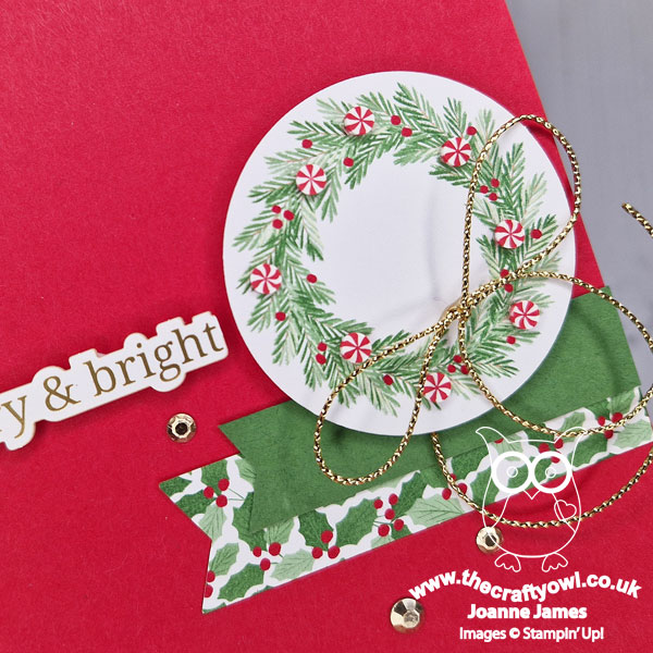 I paired my wreath with a couple of banners in Garden Green and a banner from the paper pack, a trio of gold metallic gems and a pre-diecut sentiment from the Greetings For You. Easy!