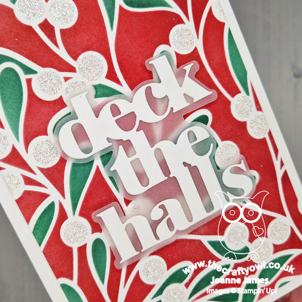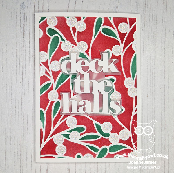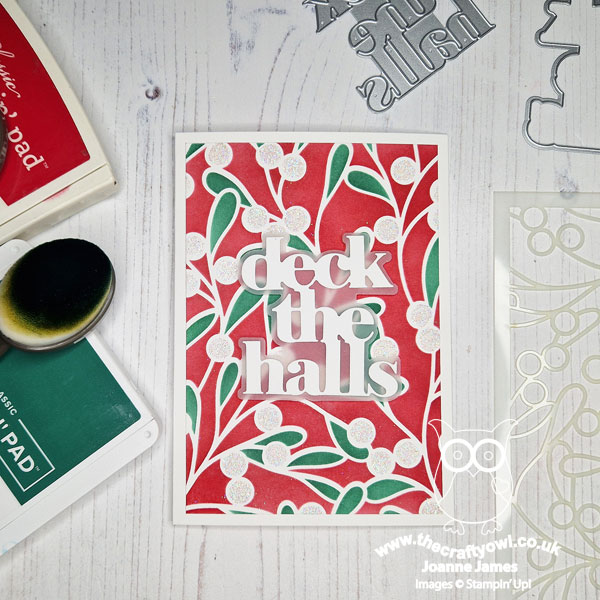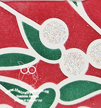 I decided today's card would feature mistletoe, with green foliage and white berries, with a festive red background. I inked the background first, then the foliage, adding ink with my blending brushes to my white cardstock. Once I'd done this, I decided the berries didn't stand out enough, so added Heat and Stick powder with Versamark and covered them in Dazzling Diamonds glitter - a little on the messy side, but the finished result is oh so sparkly!