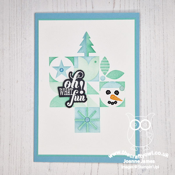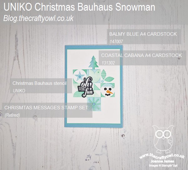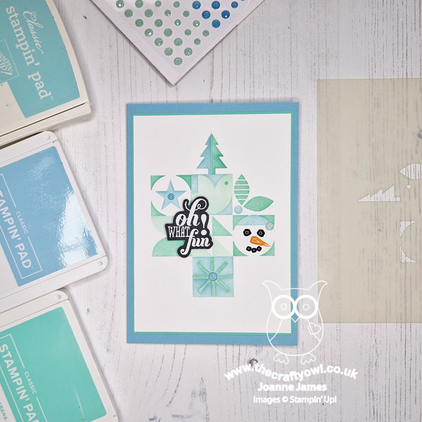 I used this stencil, called Christmas Bauhaus by Uniko, for a previous JUGS stencil challenge (you can see that card here if you missed it). Today I chose a blue and aqua colour scheme inspired by the palette over at Color Dare as I wanted to turn Santa into a snowman. During the Craft Room Clear Out (this is now worthy of capital letters, it is turning into an event of epic proportions!) I discovered part of a long retired accessory kit containing some fun snowman-themed enamel pieces, so I used these to overlay the stencilled face. I cut a base and mat in the same colours before adding my stencilled panel and a heat-embossed retired sentiment from the 'Christmas Messages' stamp set. I added a few other co-ordinating sparkly gems to complete my card:
