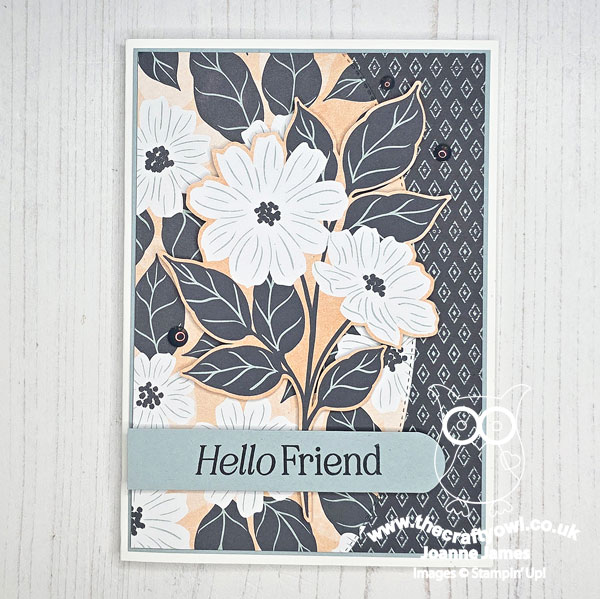 My newest and until now unopened purchase was of the Lovely Blossoms suite, part of the latest Online Exclusives release, and today's card showcases the Lovely Blossoms designer series papers, with a slight nod to the Lovely Arrangements bundle by way of sentiment and label. The Lovely Blossoms papers, featuring blues, greens, peaches and neutral are just lovely. On today's card I used two of the patterns to create my base, diecutting the edge of one with my retired Basic Border Die to get a curved edge, and overlaid this with a flower stem that I fussy cut from one of the sheets that is made up of lots of individual card front designs. It compliments the busy background florals and is perfect for the sketch: