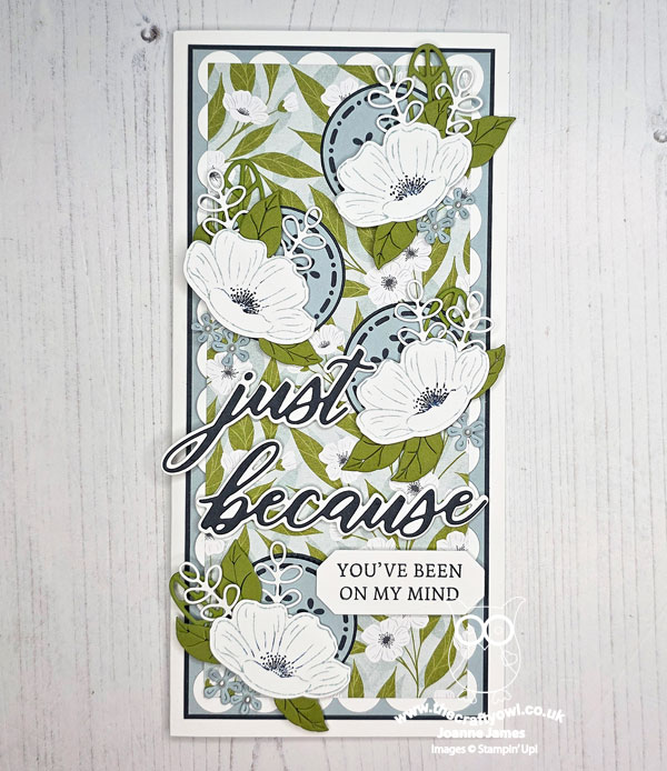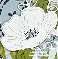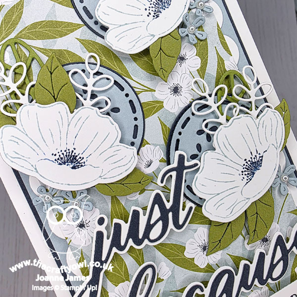 Lovely Arrangements - I wanted the florals to be the centrepiece of each focal point, so echoing the colours in the panel of Lovely blossoms DSP I used for the background, I inked them in Cloud Cover then added some Secret Sea to the stamens with a sponge dauber before stamping. I backed each flower with a couple of diecut layered circles, having first run the top one through the dicutting machine with the background die to allow some of the colour behind to show through. I then added in some diecut leaves from the set, along with some additional ones cut using the Friendly Foliage Dies to add interest to the clusters: