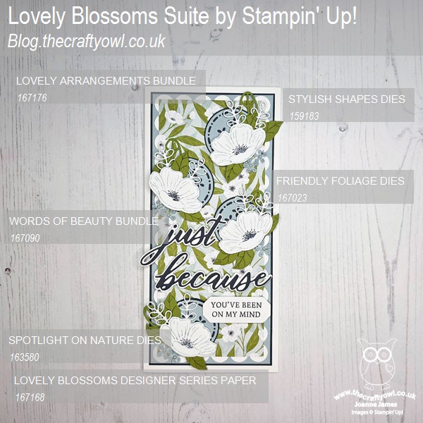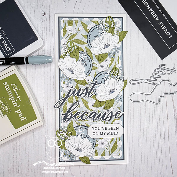A slimline card design with four shapes and a sentiment. As you know, I love a good sketch and I must say this one took on a life of its own! I have been really enjoying using my Lovely Arrangements suite of products and new that the flowers in the set would be perfect for those four focal points. I set to work and a considerable time later, I came up with this: