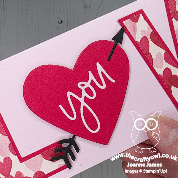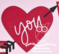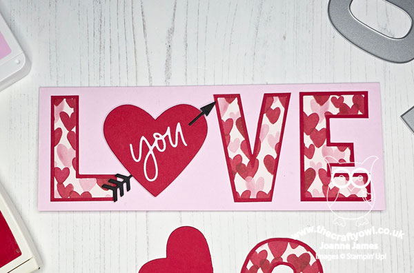 The size of my card today was totally dictated by my Party Alphabet Dies, so ended up being a mini slimline. I diecut my letters from some retired heart-patterned designer series paper (you could use the Made With Love DSP as a current equivalent) and backed them with Real Red cardstock, that I trimmed to size by hand. I added these to a Bubble Bath card base and replaced the 'O' with a diecut heart (I used the retired Sweet & Sassy Framelits for mine but the current Endless Love Dies would enable you to achieve the same effect), pierced with an arrow and overlaid with a 'you' diecut from last year's Love For You Dies:
