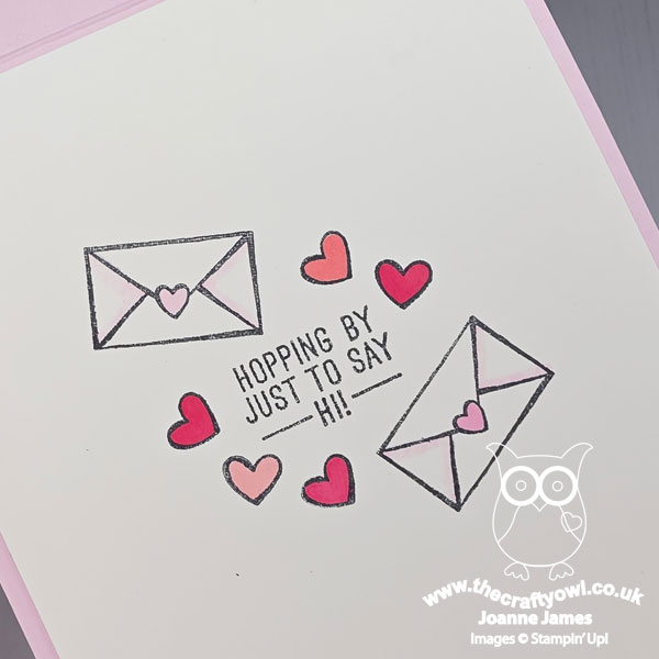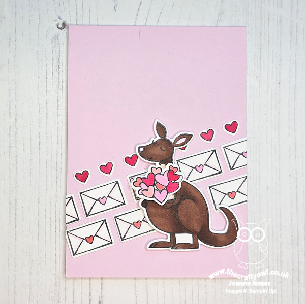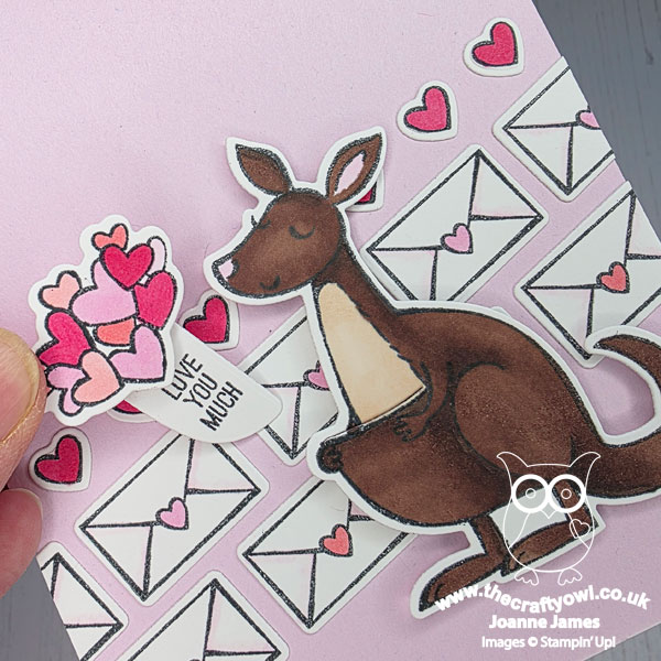 I thought those diagonals would be great for rows of pink hearts and heart-embellished letters, as a background to my cute kangaroo from the retired 'Kangaroo & Company' set bearing a cluster of hearts and a hidden message in her pouch: