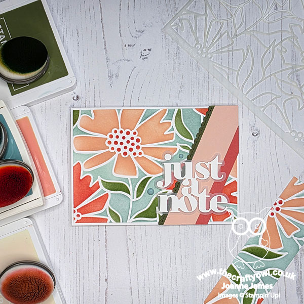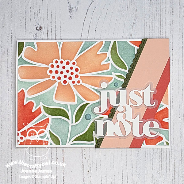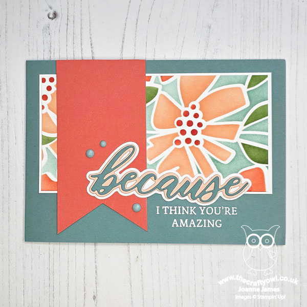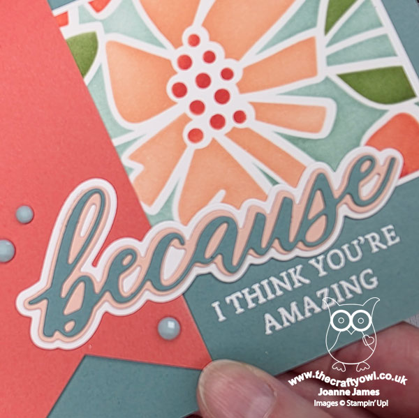 For this card I added my panel to a Lost Lagoon card base, added a banner of Calypso Coral and finished with one of my favourite Stampin' Up! Words of Beauty Dies, this time using all three layers: