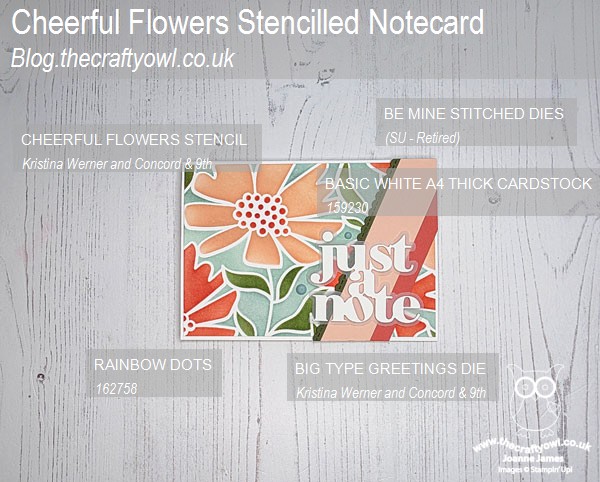 The stencil is called Cheerful Flowers by Kristina Werner and Concord and 9th and made short work of incorporating Ann's chosen colour palette. I stencilled a whole panel then trimmed it down to fit my cardfront, adding some solid colour banners and a layered diecut sentiment along with some Lost Lagoon enamel dots to finish: