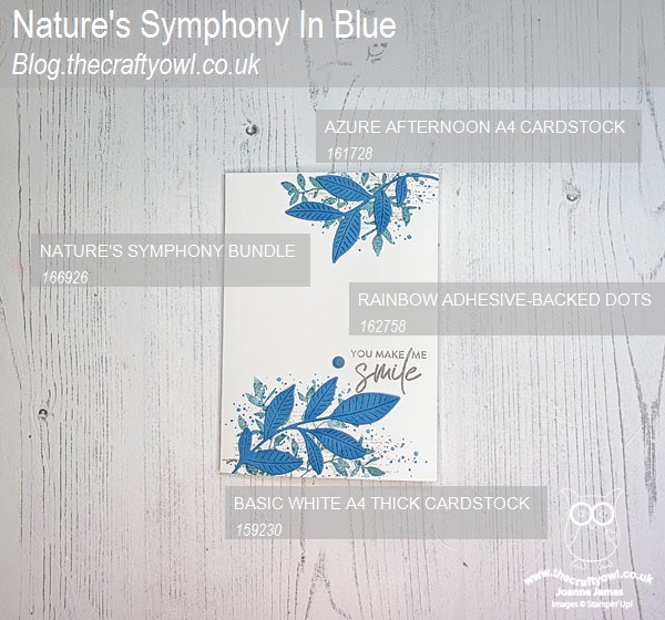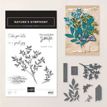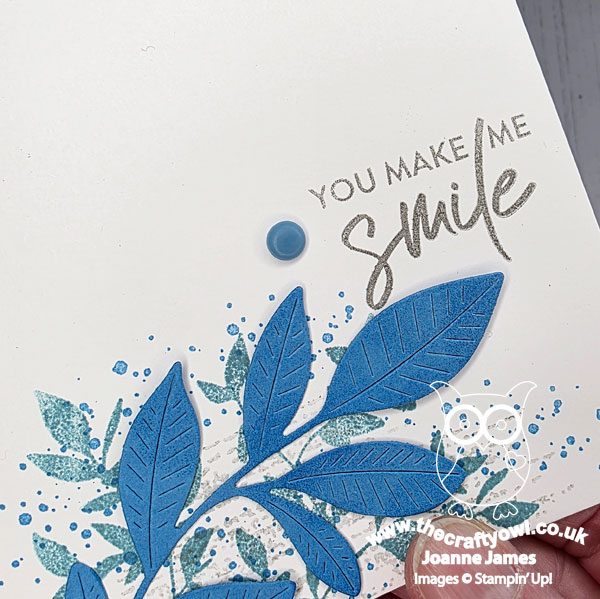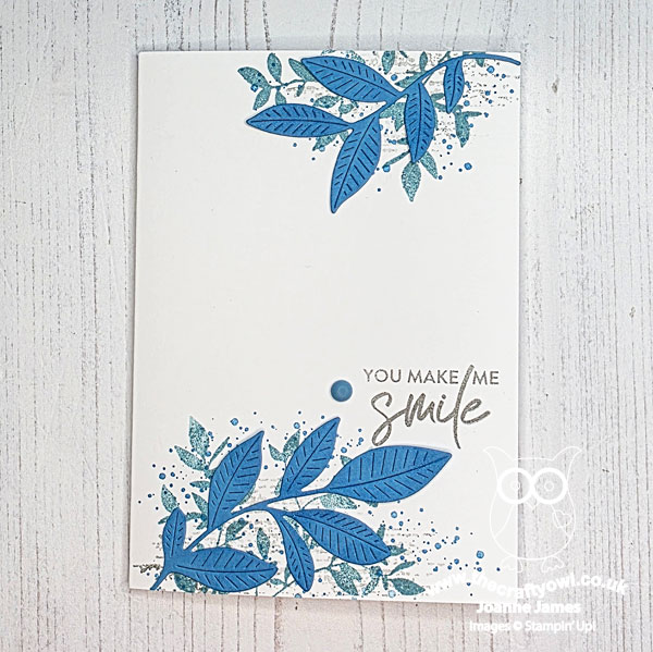 Nature's Symphony is a great set for clean and simple cards, as well as for something more layered and detailed; but there was one thing in particular that attracted me to this bundle - yes, it is that beautiful diecut leaf stem! I actually snipped it into two here and used the respective pieces for my top and bottom detail, on top of some layered stamping in all three colours using the other stamps in the set (and a splatter stamp from Notes of Nature):