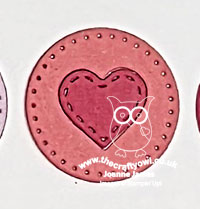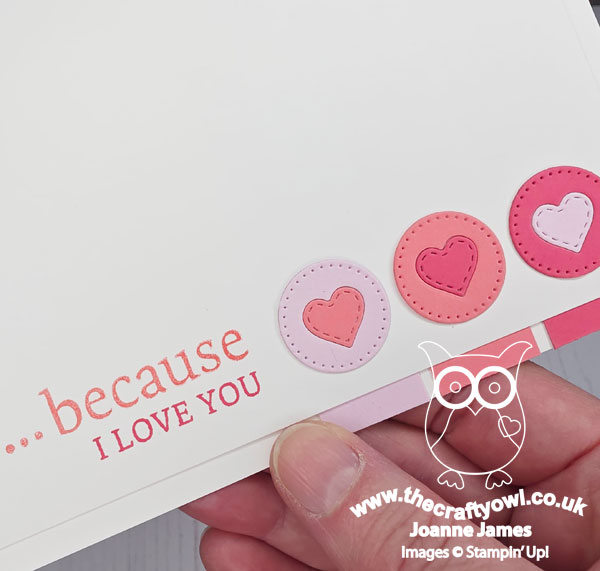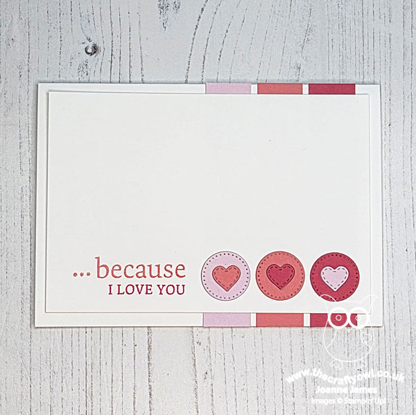I started out with three shades of pink, then diecut a trio of circles, further diecutting a heart out of the centre of each and then mixing them up and re-insetting them. I stamped my sentiment in the two darkest shades of pink - another from 'Words of Beauty' that is never off my desk these days - and added the trio of heart-filled circles to my panel, adding a trio of pink stripes to my base before adhering my upper panel for an additional hint of pink: