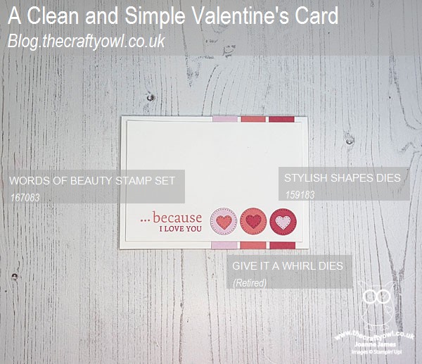 The lovely ladies over at Just Us Girls have 'Valentine' as the Word of the Week (and I missed last week's heart die challenge, so I had to include a trio of those too!), at Addicted to CAS they are all about 'Pink' and my card also means I can play along over at TicTacToe Challenge (I went across the top with Hearts/Diecutting/Pink). Now I could have gone full-on hearts and flowers, but decided to create a very clean and simple card that very much reflects my personal style - take a look: