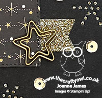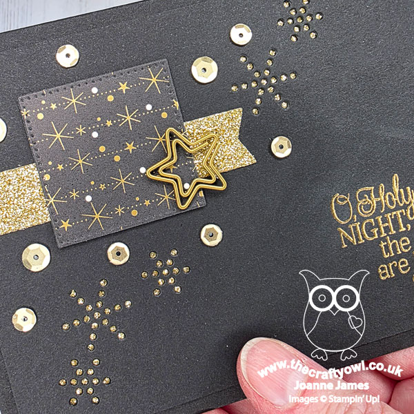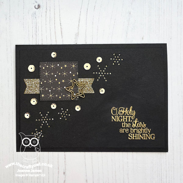 I wouldn't ordinarily choose black and gold as a colour combo for a card, but a found a scrap of retired Lights Aglow DSP in my scrap box and with a leftover gold glimmer banner thought I could make something suitable - take a look at what I came up with: