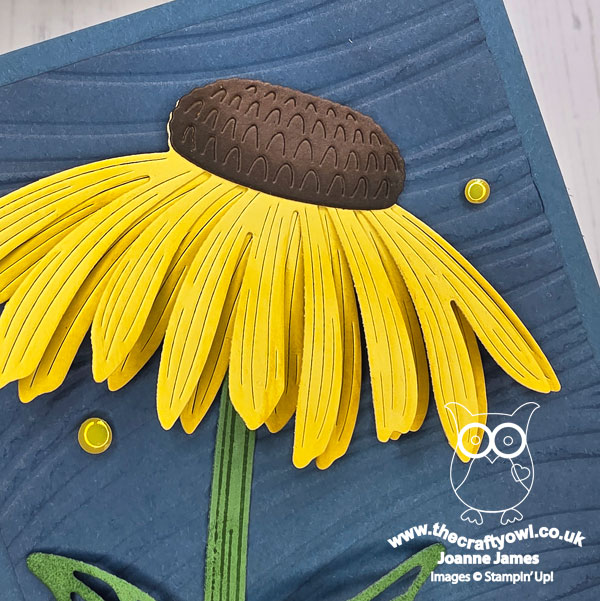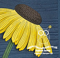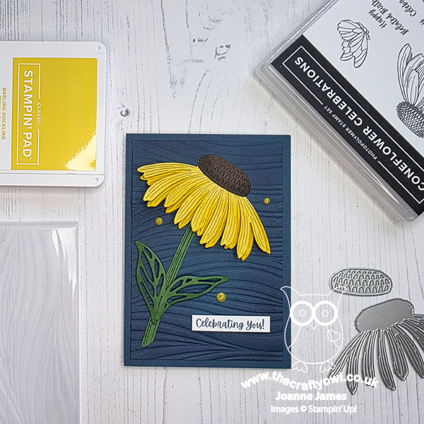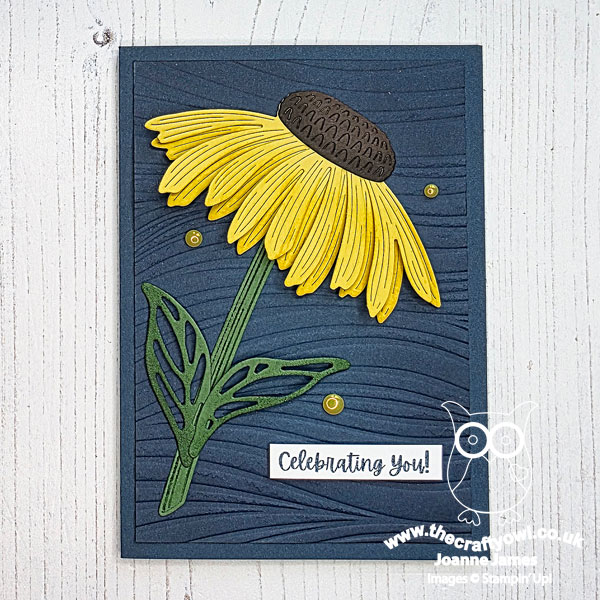 I'm sure you can see what inspired me! The moment I saw that golden pavilion, I thought of a coneflower so I had to use the Coneflower Celebrations bundle and feature one on my card. Like Christy I also used a Midnight Muse cardbase; I added a panel of embossed soft waves to pick up on the sea in the background of the cover, then added my diecut coneflower in Darling Duckling - I just love the texture and detail of the diecut: