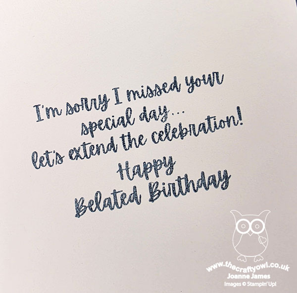 A simple sentiment and a trio of enamel pearls complete the front of my card and I added a belated birthday greeting to the inside: