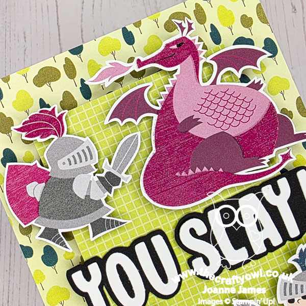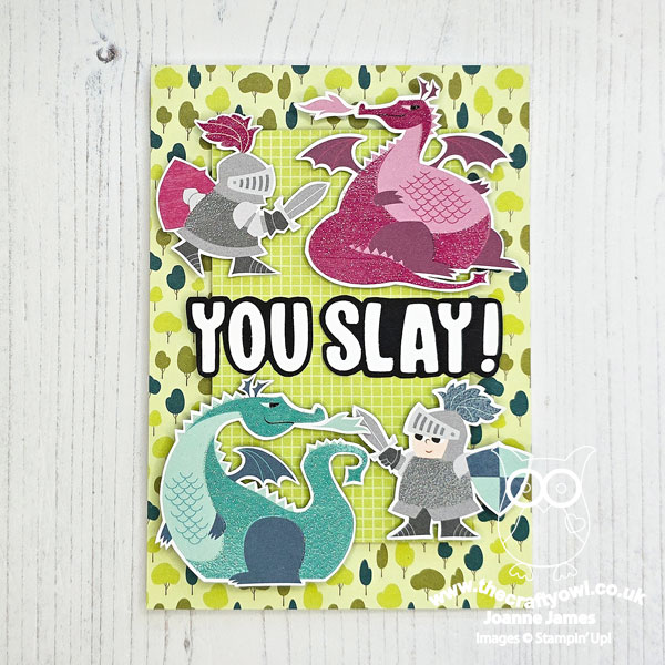 You Slay Bonus CardGiven that today is St David's Day I had to take the opportunity to make a card with a dragon (or two!) as well, so I went a little 'left field' for my next creation. The slang term 'slay' is quite popular with young people; Wikipedia states that it is used to express admiration or success, so with this in mind, I thought that I would pair a custom sentiment using the Mini Alphabet Dies with some of the knights and dragons from the Myths & Magic paper for a tongue-in-cheek congratulations card, using the sketch layout over at Hand Stamped Sentiments. Here's their layout: