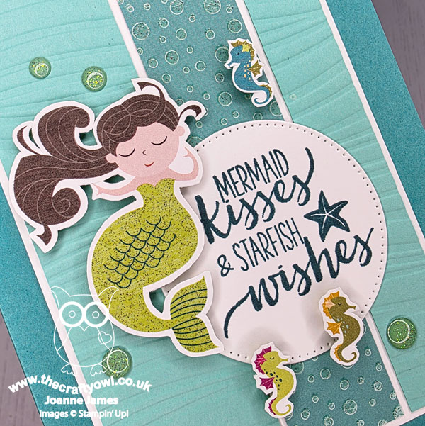 CASE The Designer - I had a lot of fun CASEing Tammy's card over at SUO Challenges this week! I chose a teal mythical underwater theme as opposed to a pink love hearts theme for my card, switched out the sentiment banner for a circle and used the tiny seahorses instead of the dimensional hearts on Tammy's card, but I retained the layout, the embossed-DSP-embossed background panel combination, albeit featuring the beautiful Soft Waves 3D embossing folder for an under the sea look and feel, combined with the sparkly column of bubbles. My card looks distinctly different to Tammy's, but it's clear to see where and how I CASEd her card as my inspiration.