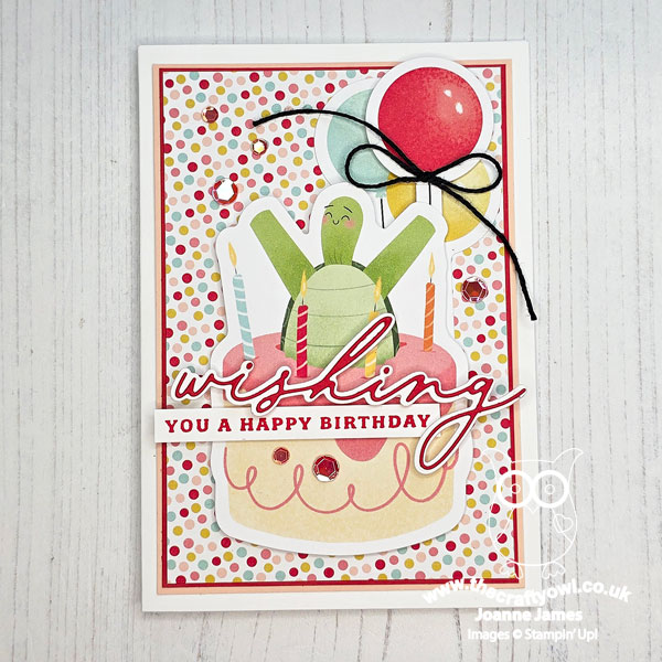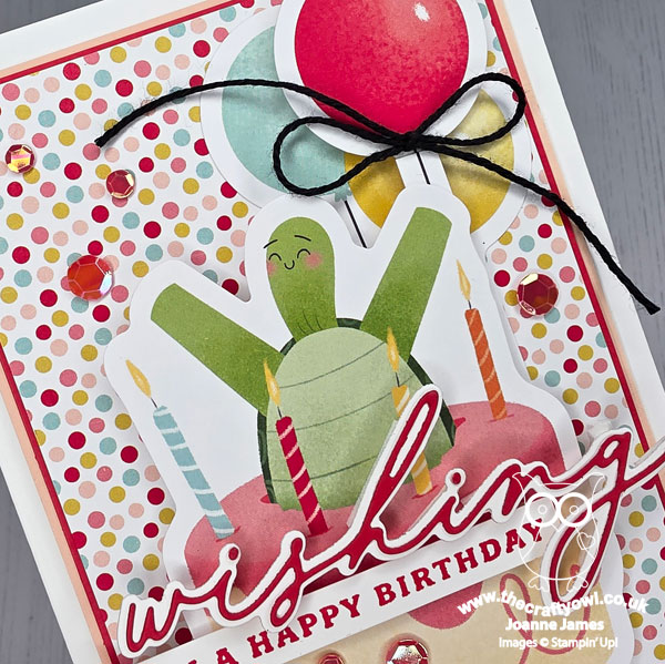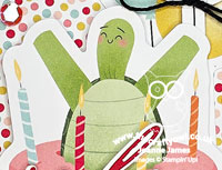Turtle-y Cute - The star of today's card is the larger-than-life turtle, complete with birthday cake. He is actually one of the stickers from the Turtle-y Cute sticker sheet, as are the balloons behind (I snipped these apart to create a layered effect). These are designed for scrapbook layouts, but they make great centrepieces for cards too. I popped mine up on dimensionals, and used a sheet of Turtle-y Cute designer series paper for my background and added a twine bow and some sequins for some celebratory sparkle: