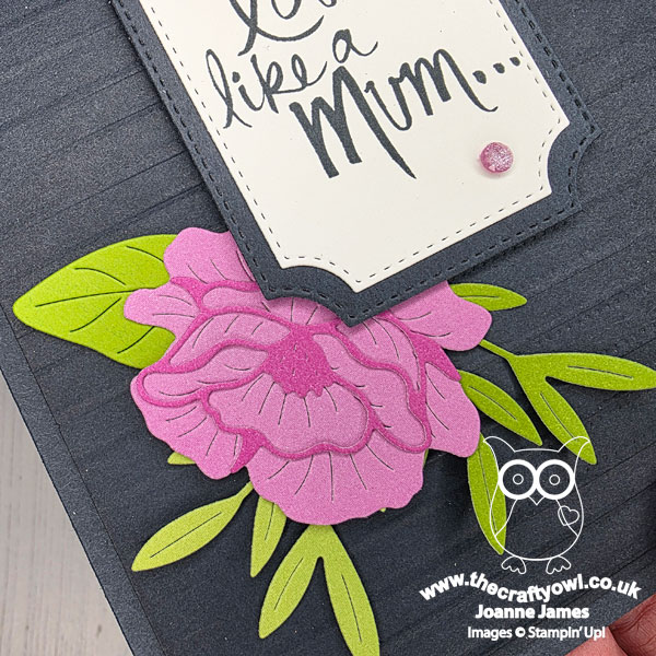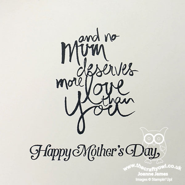 I thought that large layered camellia-type flower in the Pretty Florals Dies would make a perfect accent flower for the corners, to frame my sentiment panel. The sentiment is a retired set called 'Mother's Love' that is a great size for a large card front (I made these cards at a larger than normal A5 size). The sentiment completes inside the card as follows: