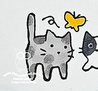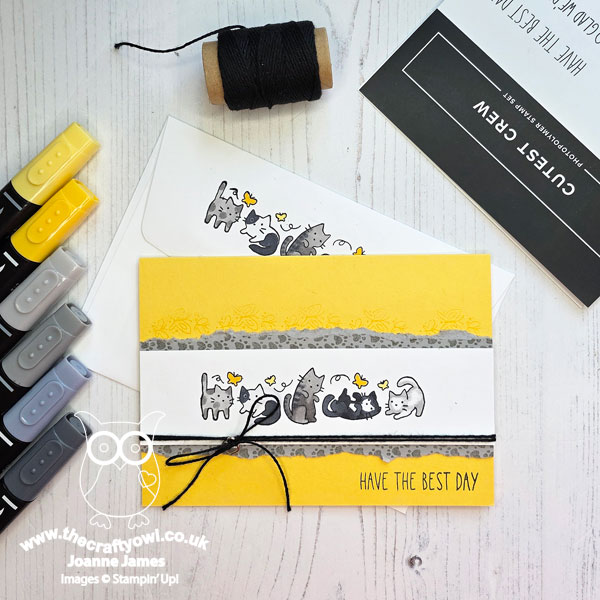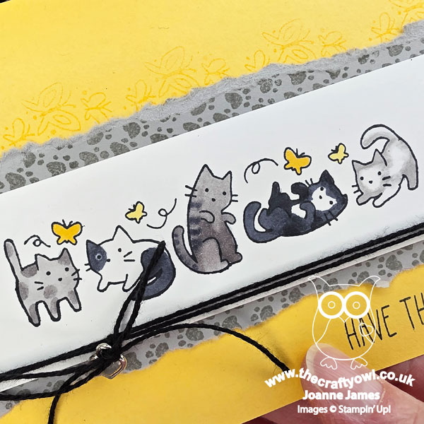 I saw the layout over at Hand Stamped Sentiments and thought it would be perfect for more of those Cute Crew kittens - and so today's card was born! I decided to use yellow for my base and add a quintet of black, white and grey kittens along with some yellow butterflies, to the central panel of my card. I stamped some pay prints onto Smoky Slate cardstock and then tore the edges to mirror the sketch, as well as adding a row of tone-on-tone butterflies stamped lightly onto the cardbase. You can see my sweet kitties in more detail below: